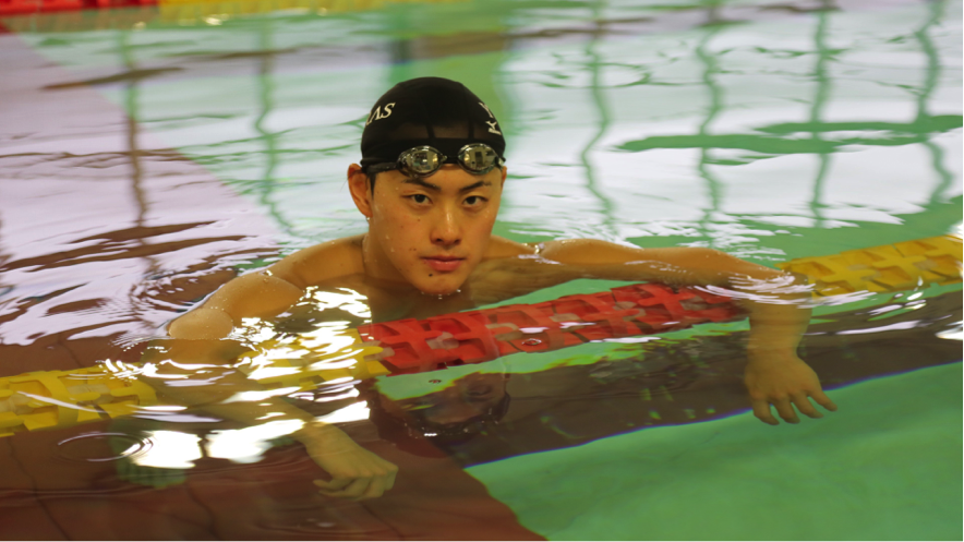 身長181cmの大きな体に、隆々としなる筋肉。鍛え上げられた強靭な体を生かしたバサロキックを持ち味に、進化を続ける背泳ぎ選手・金子雅紀。